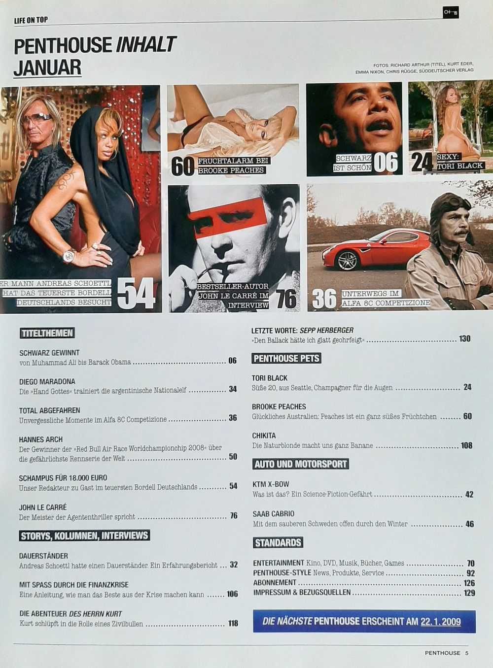 Schwarz gewinnt, Dauerständer, Traumauto Alfa 8C & MR, Im teuersten Bordell Deutschlands, Kurt Molzer als Bulle sowie Film- und Buchtipps, diverse Kulturinfos, und vieles andere mehr