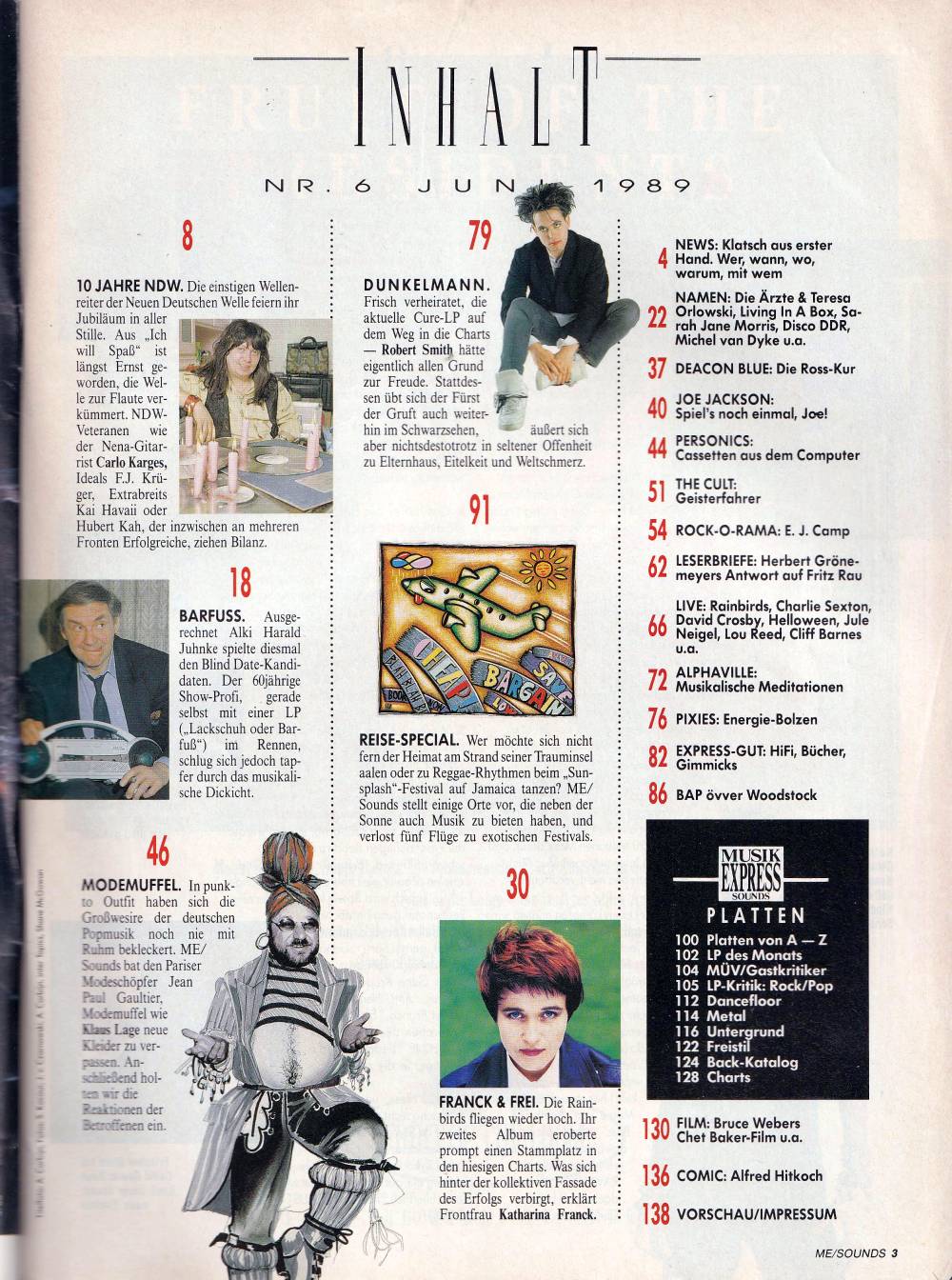 10 Jahre NDW, Deacon Blue, Bonnie Raitt, Joe Jackson, The Cult, E-J Camp (Rock-O-Rama), Alphaville, Stan Ridgway, Pixies, BAP, Plattentipps auf 19 Seiten, Charts, Live Reviews, Film- und Videotipps und vieles andere mehr