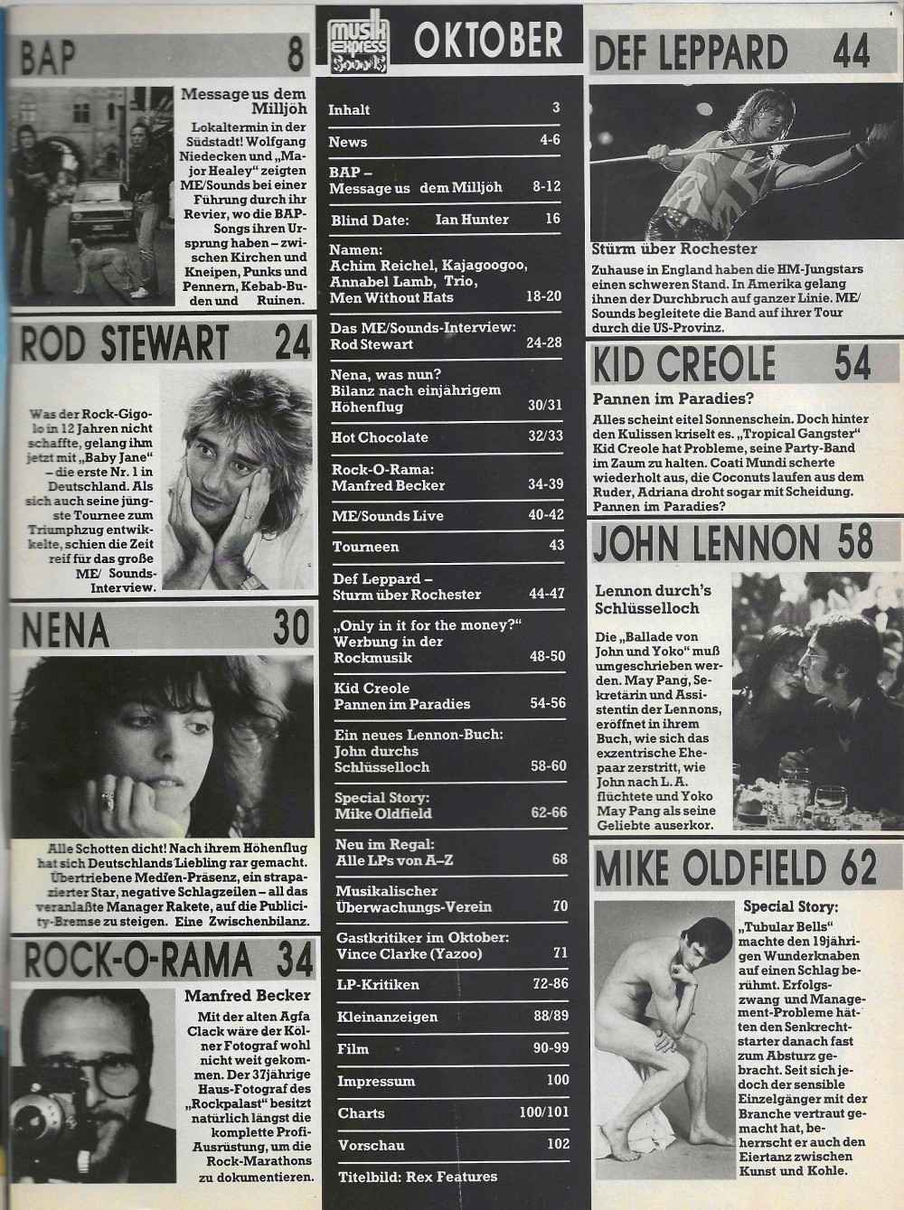 BAP, Rod Stewart (Interview), Manfred Becker (Rock-O-Rama), Nena, Hot Chocolate, Def Leppard, Kid Creole, John Lennon, 11 Seiten Plattenkritiken und vieles mehr