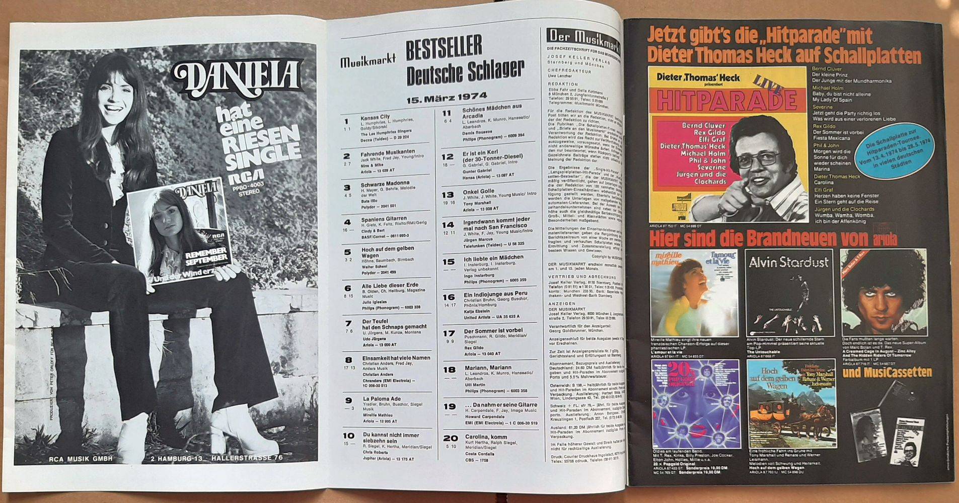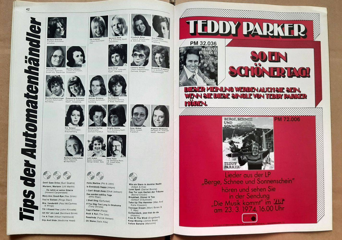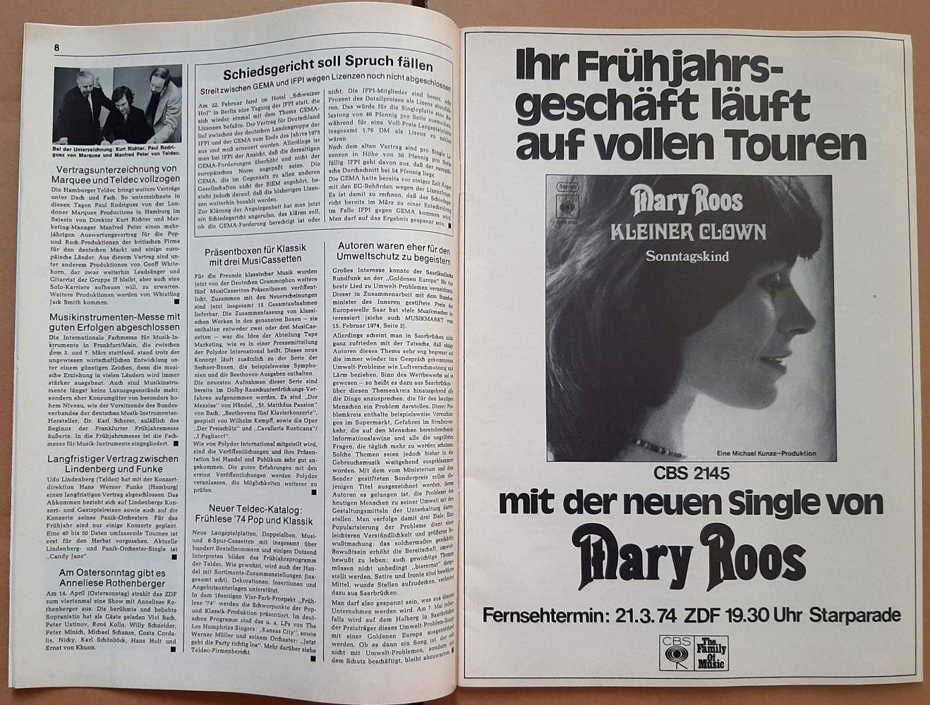 Aktuelle Neuerscheinungen auf dem deutschen Musikmarkt (Singles, MCs und LPS), diverse aktuelle nationale und internationale Charts, Händlertips, das Pop Schallplattenangebot im März 1974, der internationale Musikmarkt, zahlreiche Anzeigen der Musikindustrie und vieles andere mehr