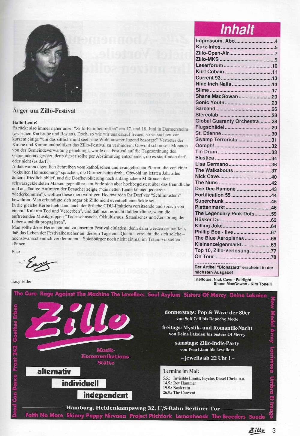 Nick Cave, Shane McGowan, Sonic Youth, Elastica, Hüsker Dü, Killing Joke, Slime, Kurt Cobain, Nine Inch Nails, Current 93, Plattenkritiken auf 13 Seiten und vieles andere mehr