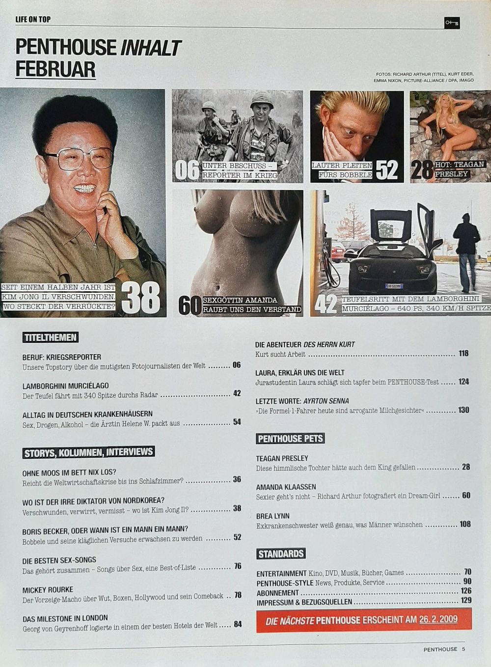 Kriegsreporter Under Fire, Finanzkrise, Kim Jong IL: Wo ist der Irre, Traumauto Lamborghini, Boris Becker, Sex & Drugs im Krankemhaus, Kurt sucht Arbeit as well as film and book recommendations, various cultural information, and much more.