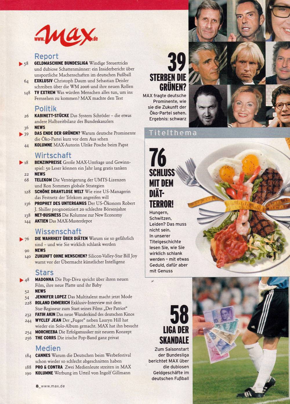Sterben die Grünen, Skandale in der Bundesliga, Madonna, TV Extrem, Jennifer Lopez, Wycleaf Jean, Erotisches Olympia and fashion & beauty tips, scene information and current film, music and book tips and much more