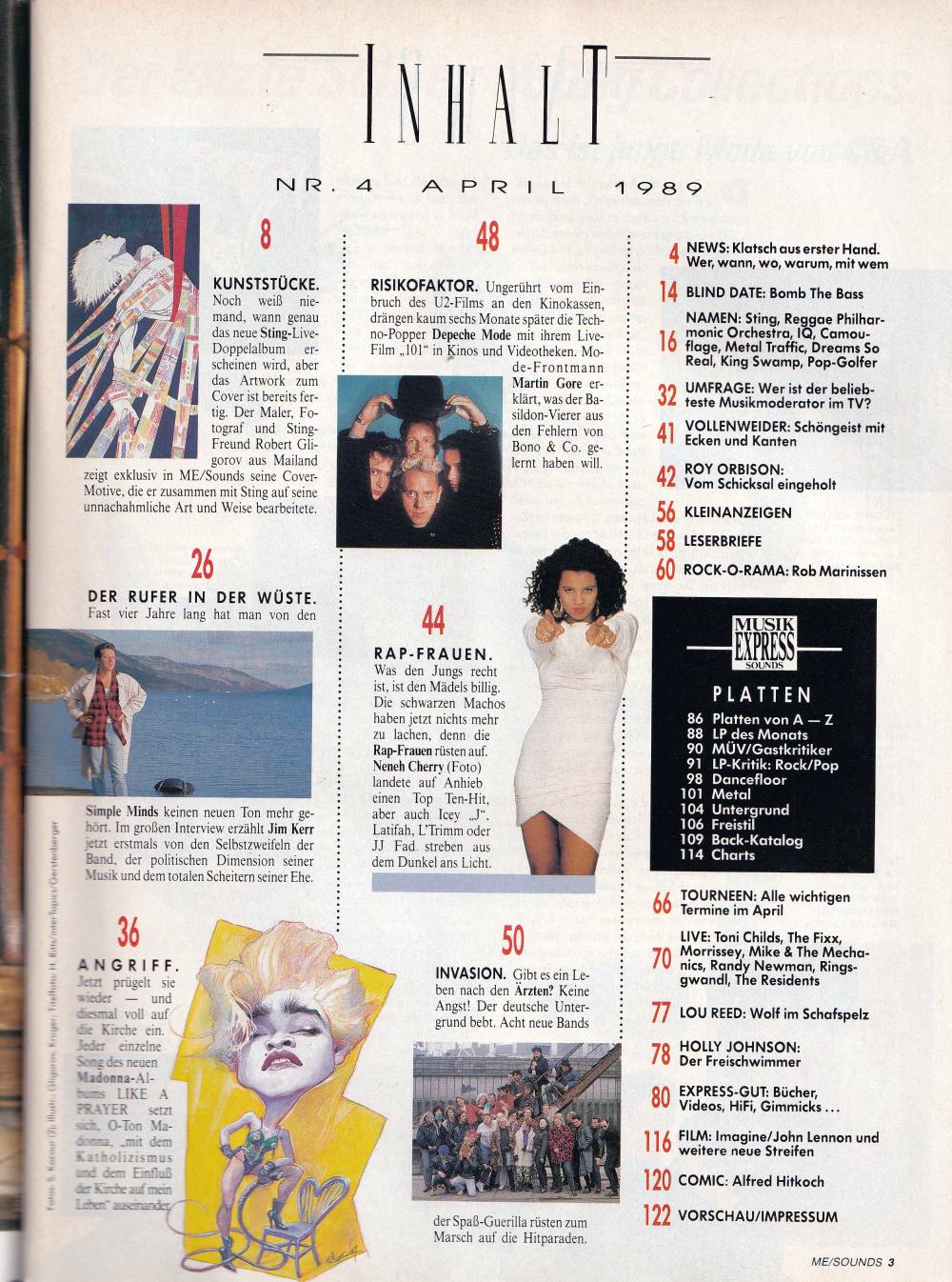 Sting, TV-Musikmoderatoren, Madonna, Andreas Vollenweider, Roy Orbison, Hip-Hop Girls, Depeche Mode, Rob Marinissen (Rock-O-Rama), Lou Reed, record recommendations on 22 pages, charts, live reviews, film and video recommendations and much more