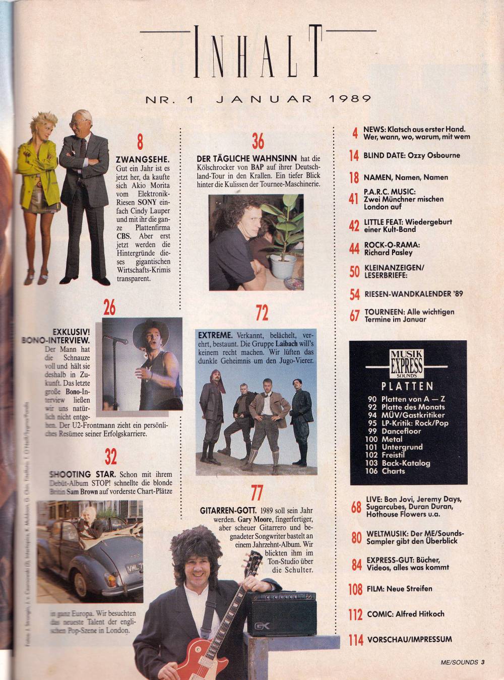 Sony kauft CBS, Sam Brown, Auf Tour mit BAP, Little Feat, Richard Pasley (Rock-O-Rama), Laibach, Gary Moore, Weltmusik, record recommendations on 16 pages, charts, live reviews, film and video recommendations and much more