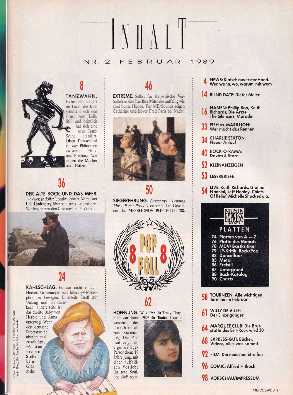 Disco in Deutschland, Philip Boa, Fish & Marillion, Charlie Sexton, Udo Lindenberg, Davies & Starr (Rock-O-Rama), Les Rita Mitsouko, Willy De Ville, record recommendations on 14 pages, charts, live reviews, film and video recommendations and much more