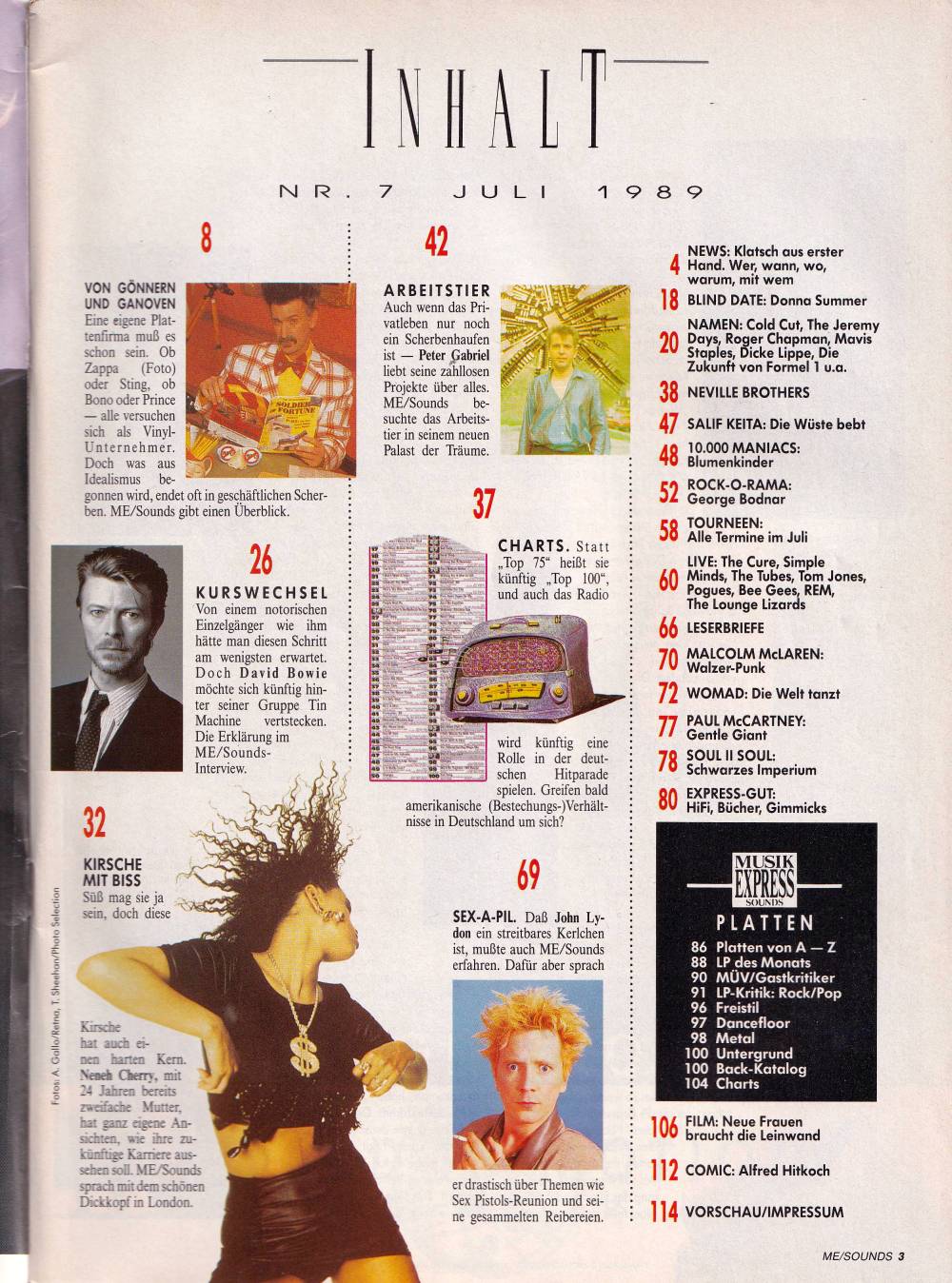 Musiker als Plattenboss, Coldcut, Neneh Cherry, Charts, Neville Brothers, Peter Gabriel, Salif Keita, George Bodnar (Rock-O-Rama), John Lydon, Weltmusik, Paul McCartney, record recommendations on 16 pages, charts, live reviews, film and video recommendations and much more