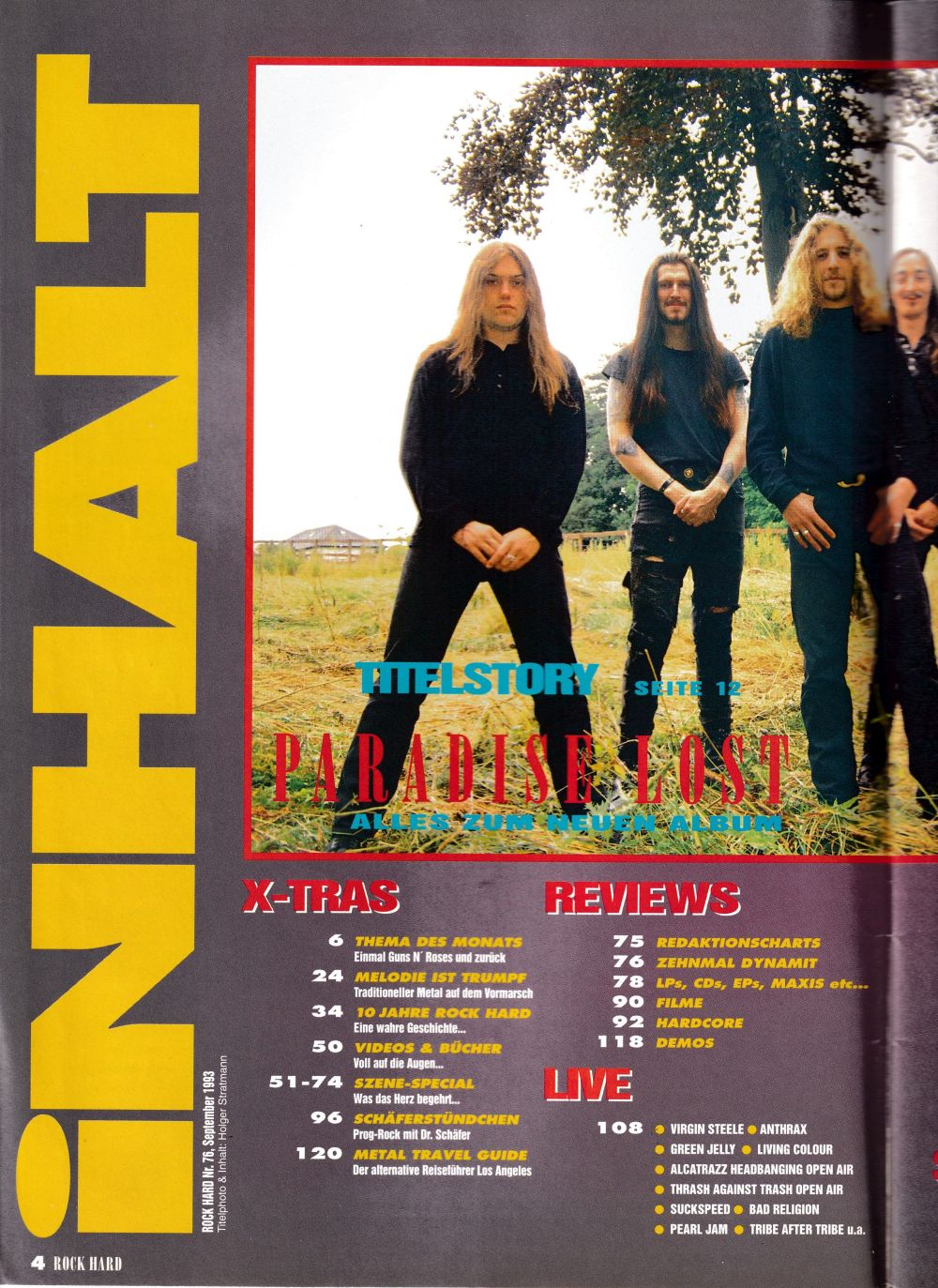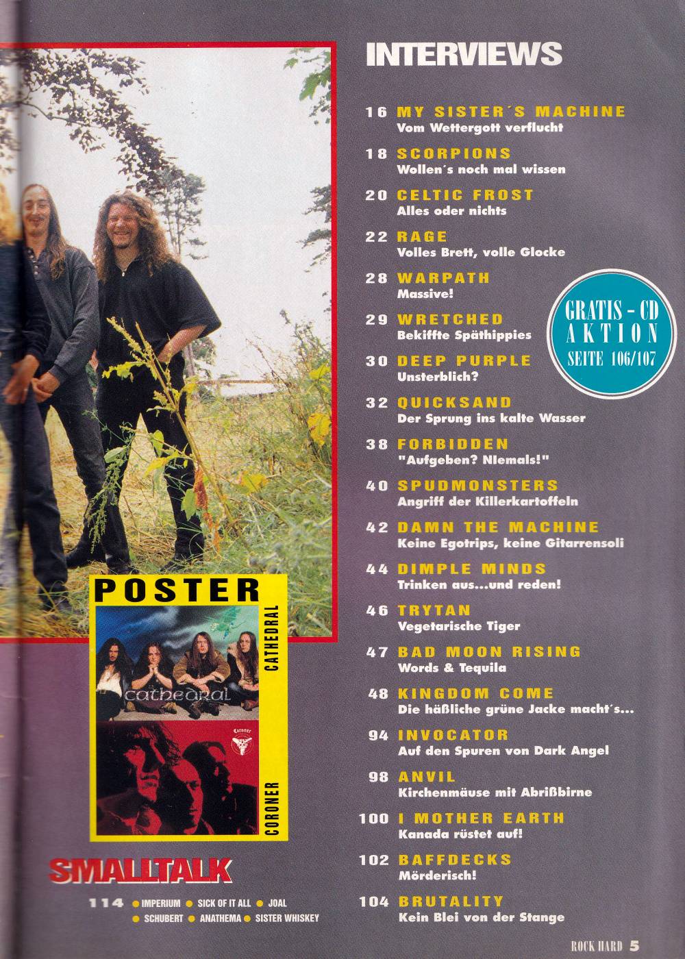Paradise Lost, Scorpions, Deep Purple, Forbidden, Rage, Kingdom Come, Celtic Frost, Dimple Minds, Warpath, Anvil, record tips on 12 pages, charts, live reviews and much more