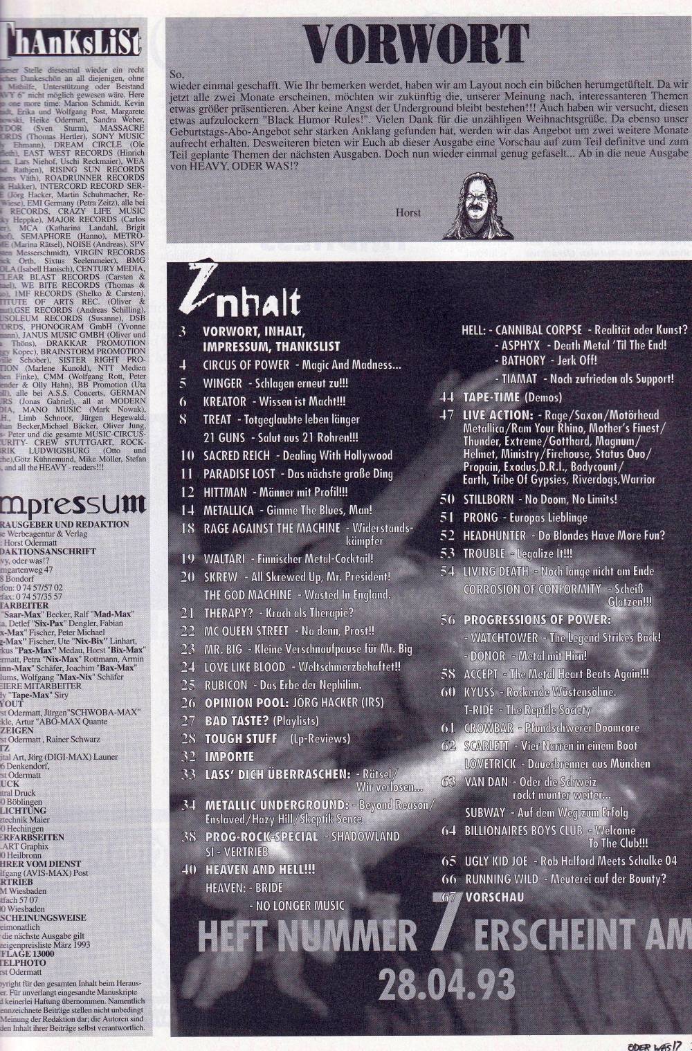 Circus Of Power, Winger, Kreator, Sacred Reich, Paradise Lost, Metallica, Waltari, Mr. Big, Prong, Accept, Running Wild, record tips on 6 pages, live reviews and much more