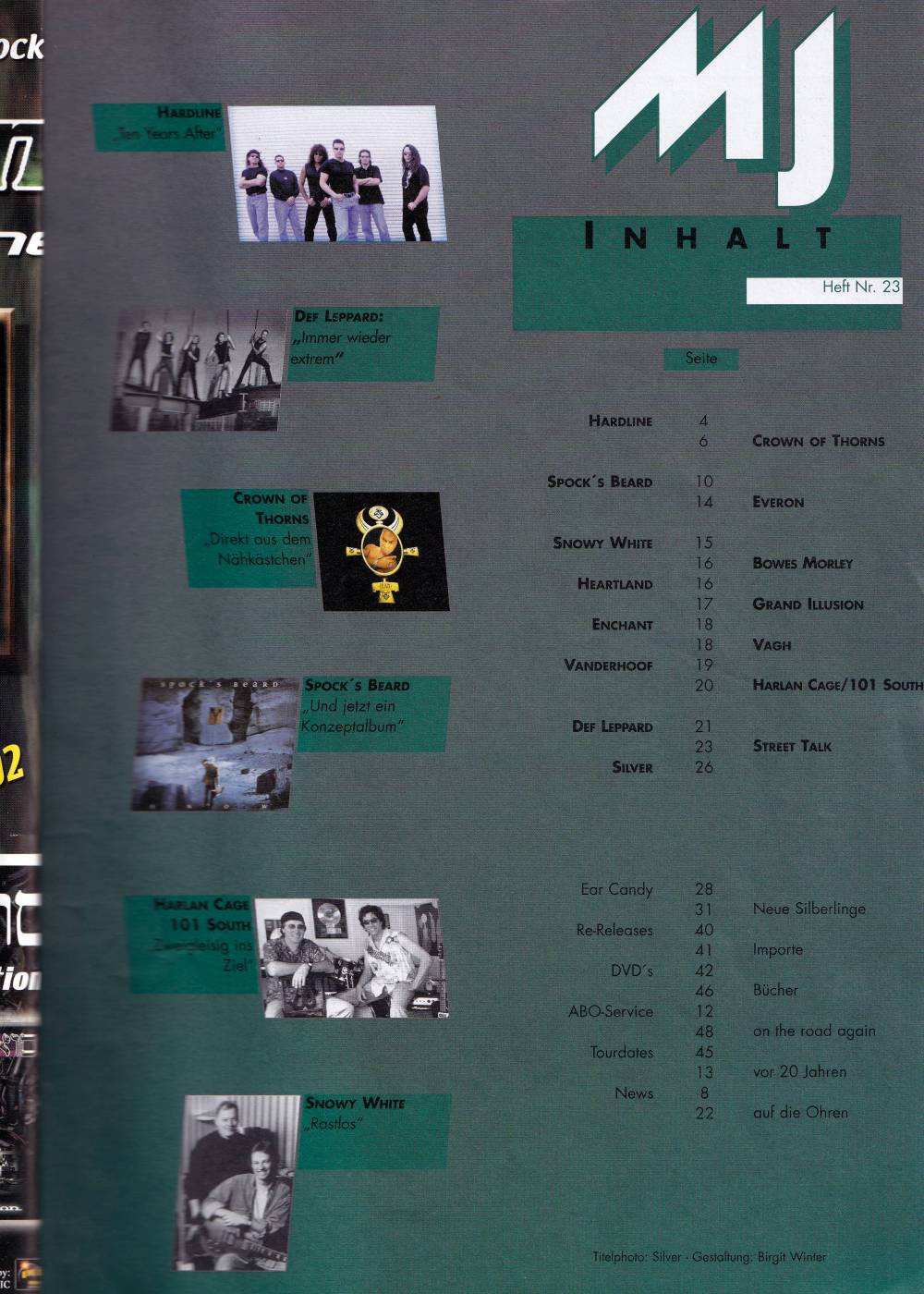 Def Leppard, Hardline, Crown Of Thorns, Spock's Beard, Silver, Everon, Snowy White, Heartland, charts, record reviews on 13 pages, short news, tour dates