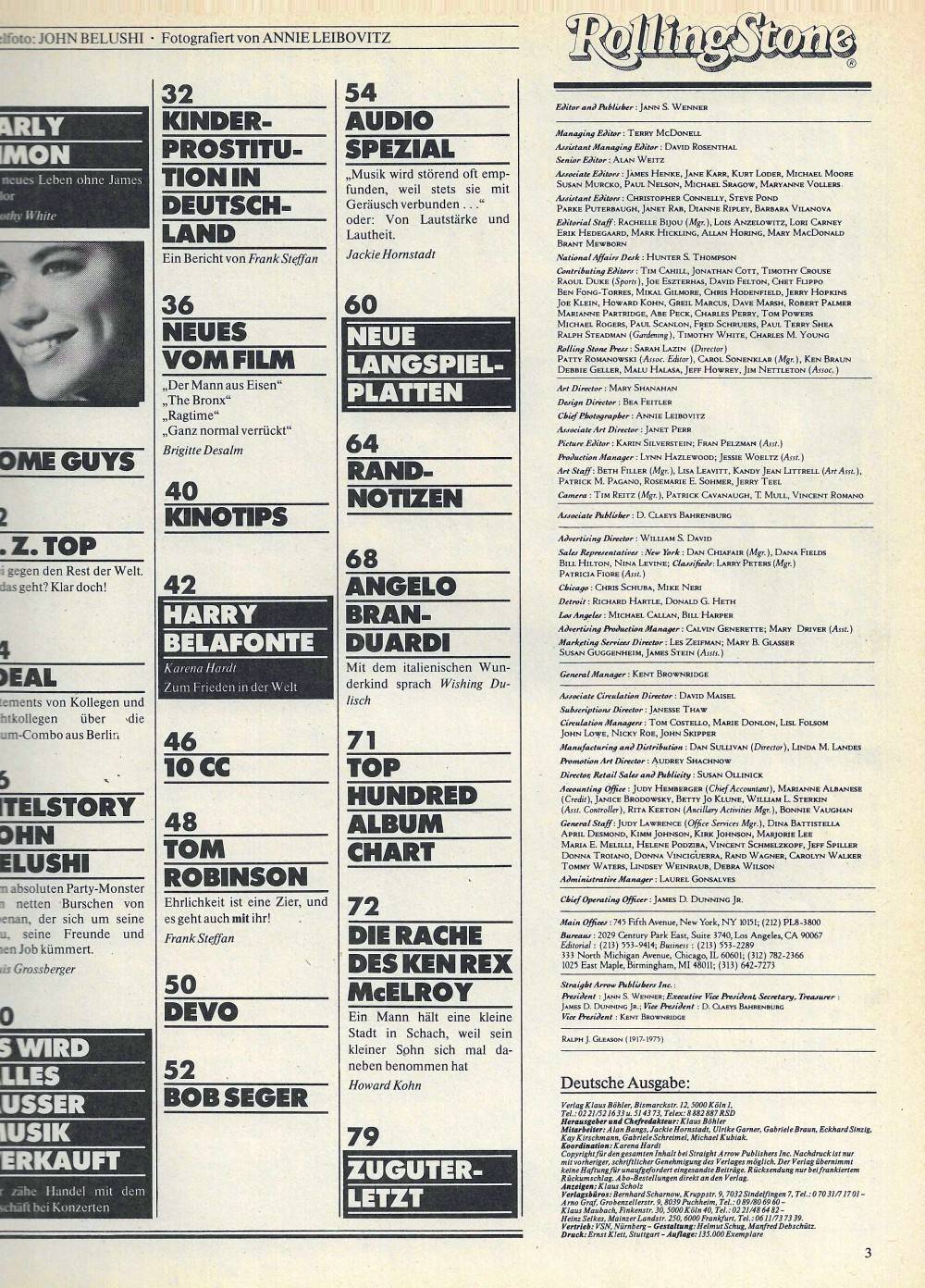 Carly Simon, ZZ TOP Interview, Ideal, John Belushi, Harry Belafonte, 10CC, Tom Robinson, Devo, Bob Seger, Angelo Branduardi, Filmtipps, Charts, Plattenkritiken and much more